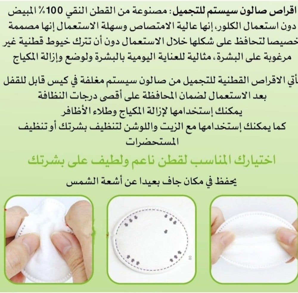 - تأتي الاقراص القطنية للتجميل من صالون سيستم مغلفة في كيس قابل للقفل بعد الاستعمال لضمان المحافظة على أقصى درجات النظافة